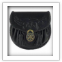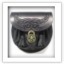 Pouch sporrans with thick leather back and soft leather pouch front. Also has Celtic knot-work design embossed on the flap. The pouch is pulled shut using thong interweaved at the rim, and the flap is fastened using an antique turn lock.(Straps and chains are included).